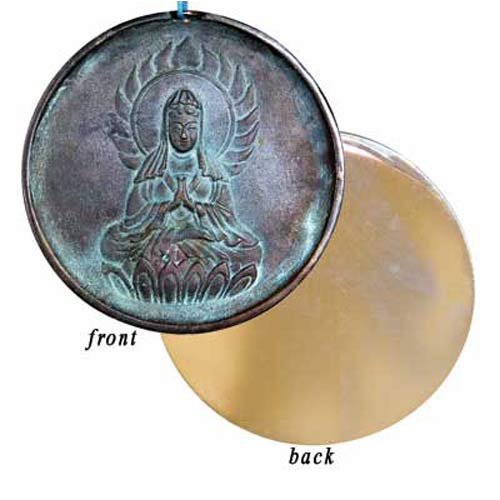 With this ancient Chinese curiosity, a fascinating phenomenon of light reflection occurs. One side is a highly polished brass mirror-like surface and the other side has a relief image of Buddha with a verdigris finish. Catch a ray of sunlight on the mirror side, direct the reflection onto a flat wall and, like magic, a Buddha image appears. Diameter: 4.25 inches.