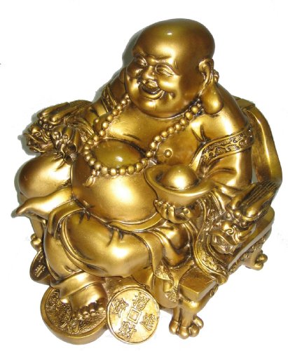 Statues of fortune all tell a story. These large golden symbols each have a unique meaning. This popular Chinese form will spark many conversations. This smiling Buddha conveys both beauty and meaning in the Feng Shui tradition. That simple twist of the mouth conveys humor and happiness. Will bring its owner luck and prosperity. Made from durable resin and finished in rich gold. Measures 11 inches high
